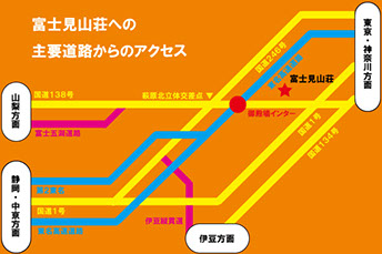 東名高速道路をご利用の方は、御殿場ICから箱根方面へ、それ以外の方は御殿場市内から国道138号を箱根方面へ。県道401号と国道138号の合流地点から約800m進んだ御殿場温泉会館入り口交差点を左折して約1500mです。