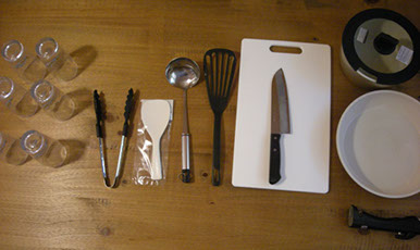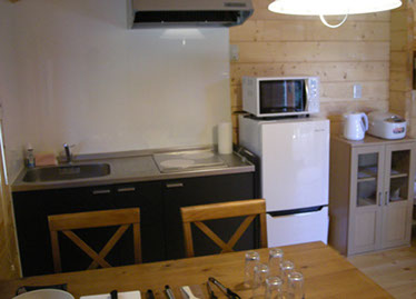 各棟に、調理用の鍋・フライパン・包丁・まな板・フライ返し・レードル・しゃもじ・トング・グラスが備え付けられています。(備え付け調理器具のバーベキュー場でのご利用はお控えください。)